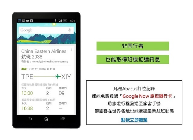 第150403期-如何尋找更便宜票價? & Abacus服務提升,專人優先處理 & 雲端工作站 –航空公司電話查詢 & 【Google Now旅遊隨行卡】西安飛往台北班機取消