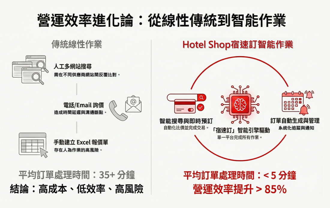 這是一套 B2B2C「全流程純訂房」解決方案:將傳統「多網站比價 + 人工詢價 + 手動整理」重構為「單一入口、流程可控、效率可量測」的網路作業。